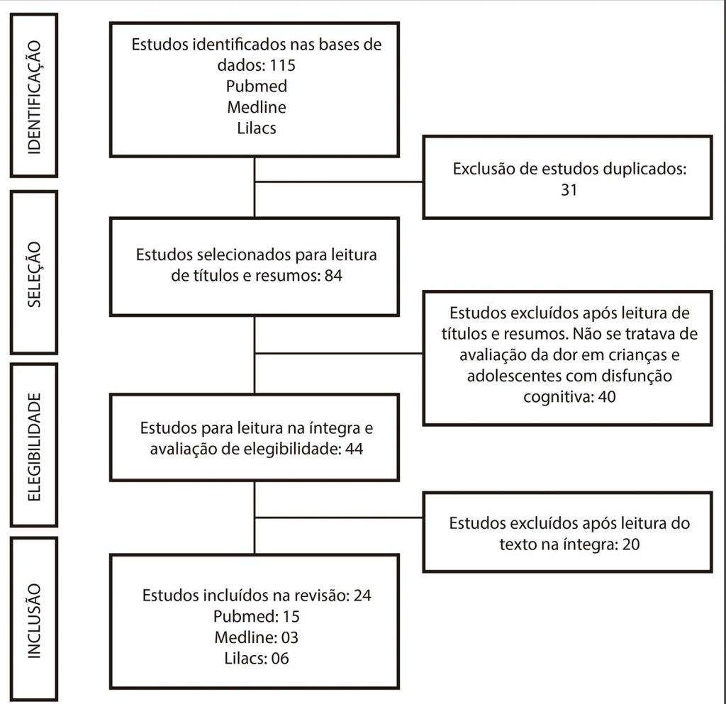 Revisão integrativa da literatura, realizada nas bases de dados PubMed, MEDLINE e LILACS em fevereiro de 2019, utilizando os critérios de inclusão: resumos e/ou títulos que contemplassem a dor em crianças e/ou adolescentes com disfunção cognitiva; estudos publicados nos últimos 10 anos nos idiomas inglês, português e espanhol. Foram excluídos da amostra os estudos duplicados e os provenientes de literatura cinzenta.