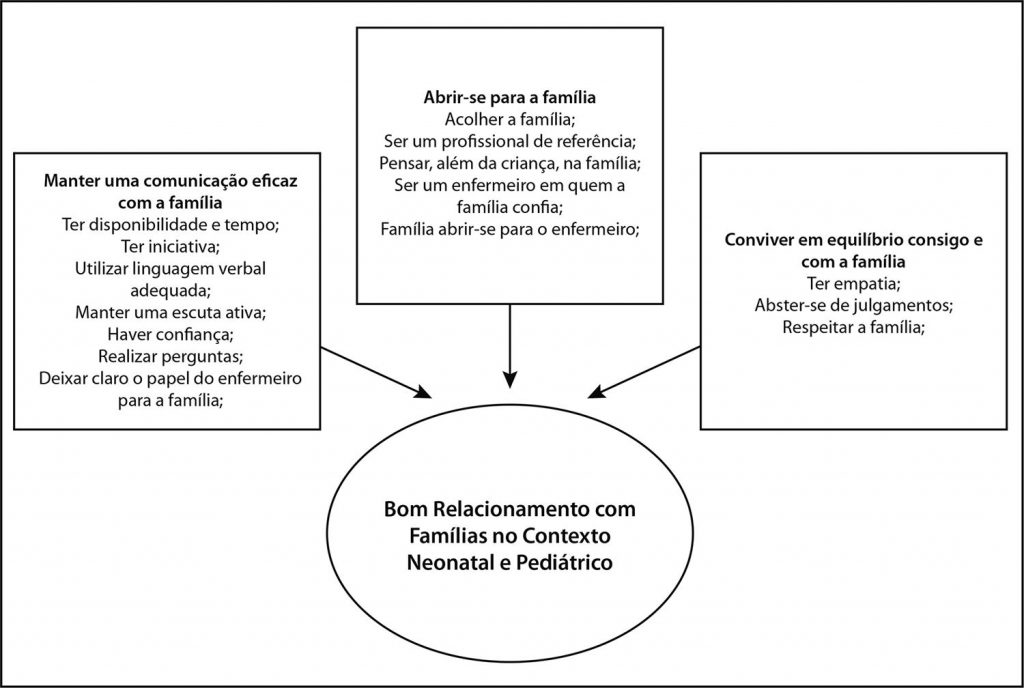 O bom relacionamento com famílias está representado por três categorias: abrir-se para a família; manter uma comunicação eficaz com a família; conviver em equilíbrio consigo e com a família. A comunicação eficaz constitui o cerne do bom relacionamento.