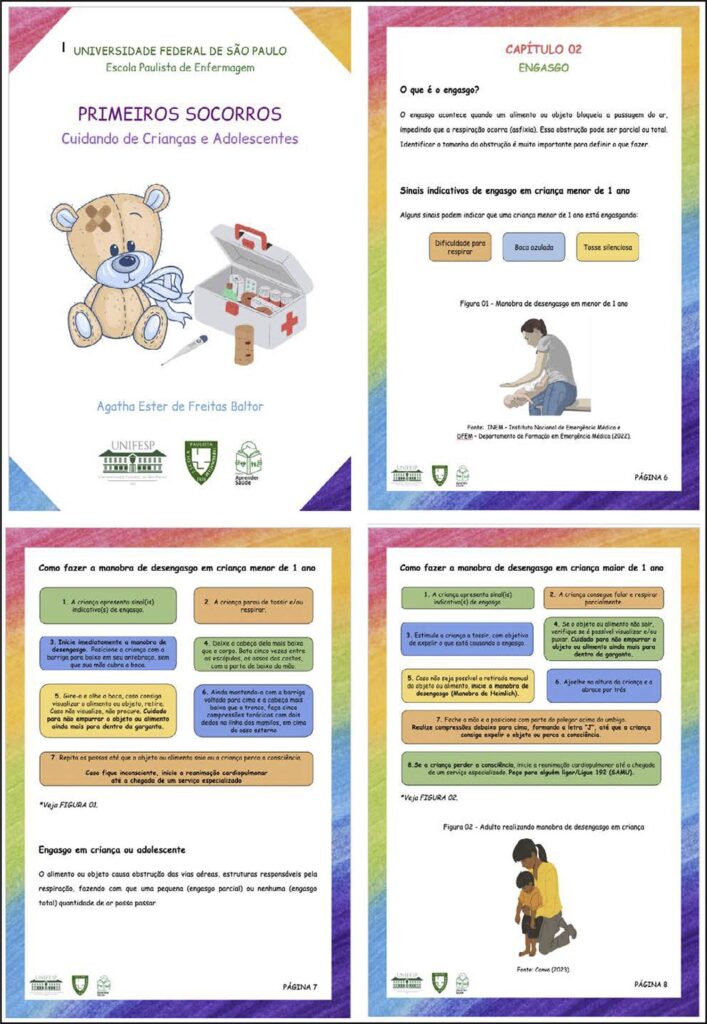 O e-book Primeiros Socorros: no Cuidado de Crianças e Adolescentes demonstrou ser um recurso didático eficaz e validado e que contempla os conteúdos atualizados sobre situações de emergência envolvendo crianças e adolescentes, fornecendo orientações de Suporte Básico de Vida, aprimorando o letramento em saúde das pessoas leigas. A validação do conteúdo confirma sua adequação e eficácia em atender aos objetivos educacionais propostos, bem como sua relevância e apresentação.