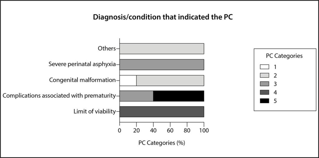A total of 26 participants, with 17 (65.4%) being preterm, 14 (53.8%) female, and 18 (69.2%) weighing less than 2,500 grams. Regarding outcomes, 18 (69.2%) deceased, 5 (19.2%) were discharged with follow-up, and 3 (11.5%) were transferred. Regarding palliative care classification, 9 (34.6%) were categorized with a diagnosis of conditions with a considerable risk of death, followed by 8 (30.8%) at the limit of viability.