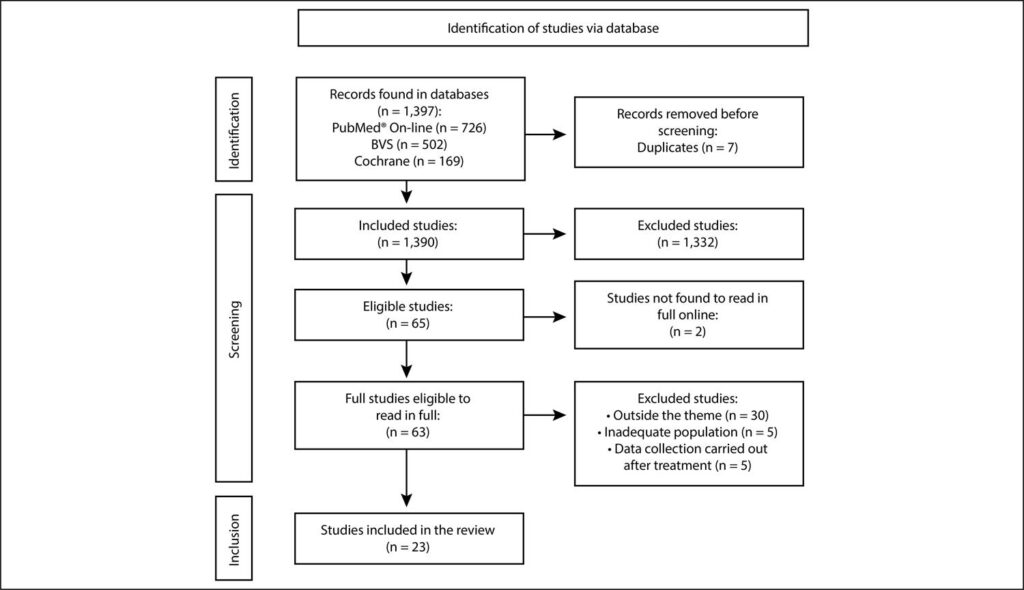 Obtiveram-se 1.397 artigos. Pela leitura de seus títulos e resumos, foram excluídos 1.332. Do restante, 2 não foram encontrados na íntegra e 40 foram excluídos após leitura na íntegra, totalizando amostra final de 23 artigos.