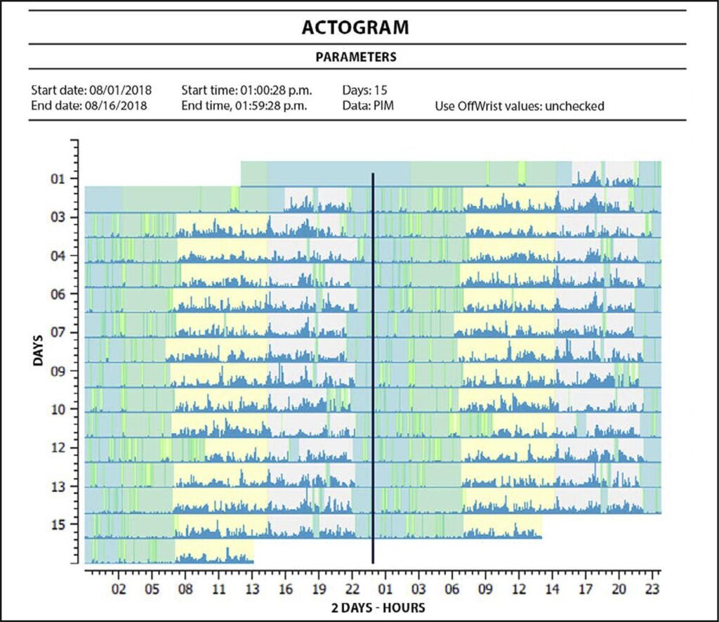 The sample consisted of 12 children with a mean age of 7.6 (±1.1) years. The mean total sleep time was 7.9 (±0.8) hours with an efficiency of 89.9% (±2.67). The 6-sulfatoxymelatonin level was 14.4 (±8.9) µg/dL, and the mean daily use of electronic devices was 2.8 (±1.8) hours. There was a significant difference in total sleep time between children who studied full or late.